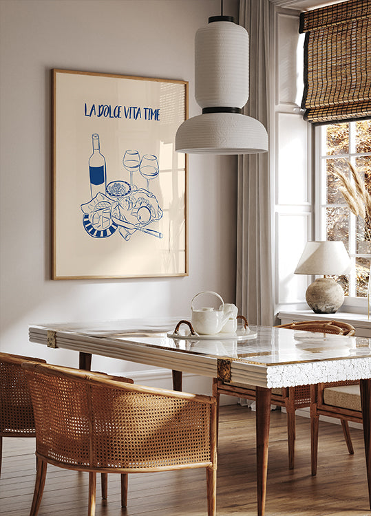 A charming minimalist line illustration of a Mediterranean spread featuring wine, cheese, bread, and fruits. The text "La Dolce Vita Time" evokes the essence of slow living, indulgence, and shared moments. Ideal for kitchens, dining spaces that celebrate Italian lifestyle.