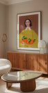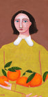 Sharyn Bursic’s Lady with Oranges captures a serene brunette with clear blue eyes, seated against a sunlit yellow backdrop, cradling vibrant citrus. Painterly brushwork and naive, retro charm evoke nostalgic kitchen warmth, blending figurative elegance with bold graphic shapes for a fresh, joyful focal point.