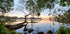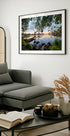 A serene nature print capturing the stillness of a calm lake at sunset, framed by lush green trees and smooth shoreline rocks. The mirrored reflection of the sky and branches creates a peaceful, dreamlike composition — perfect for bringing a sense of tranquility to bedrooms, living rooms, or any nature-inspired space.