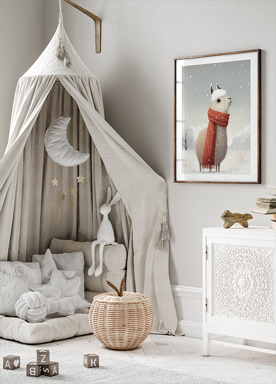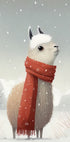 Lama 3 by Bilge Paksoylu captures a calm, wintry moment in the countryside: a gentle llama stands amid fresh snow, breath misting in the cold, framed by quiet fields and distant farmhouse tones. Soft, matte light and minimal hues create a pastoral mood that’s playful yet refined, perfect for kids’ rooms or cozy spaces.