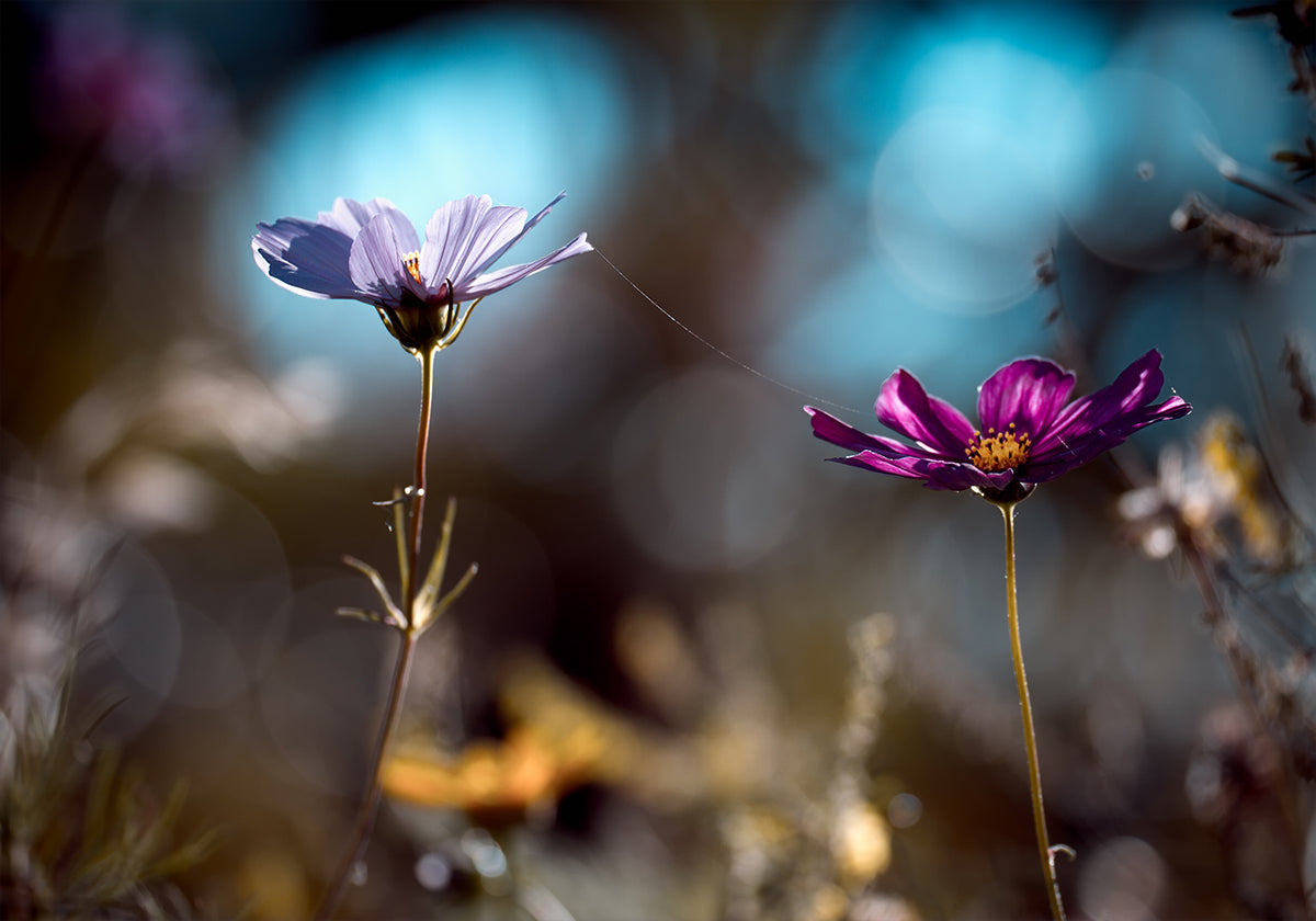 Le lien by Fabien BRAVIN captures an intimate botanical duet: two violet blooms leaning toward each other, gently bound by a fine thread. Bathed in warm backlight and soft bokeh, the petals glow with tenderness, evoking connection, romance, and serenity in a refined macro composition. A tender homage to threads of love and the poetry of nature.