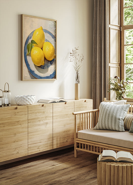 A timeless still life featuring three vibrant lemons with green leaves on a classic ceramic plate with a blue rim. The painterly texture and soft light evoke a serene, Mediterranean kitchen scene.