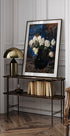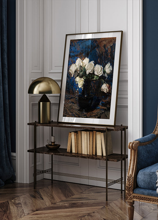 A dramatic and richly textured still life painting by Leon Wyczółkowski, featuring a bouquet of white roses in a dark vase against a deep blue-toned background. The expressive brushstrokes and contrast between light and shadow create a captivating and moody composition. A stunning piece for art lovers, vintage decor enthusiasts, and those who appreciate classic floral paintings.