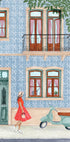 Drift into sunlit Lisbon with Giovanna Julião’s illustration: a vintage scooter poised by an ornate doorway, blue and white azulejo tiles aglow, and a woman in a red dress gliding past leafy facades. A pastel ode to old-town charm, retro travel romance, and the Mediterranean warmth of tiled streets.