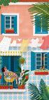 Sunlit Lisbon spills across the frame: pastel townhouses clad in patterned tiles, wrought-iron balconies overflowing with greenery, laundry drifting in the breeze. A young woman leans at her window as a cat stretches above and a cheerful dog trots below—an everyday Mediterranean moment of color and warmth.