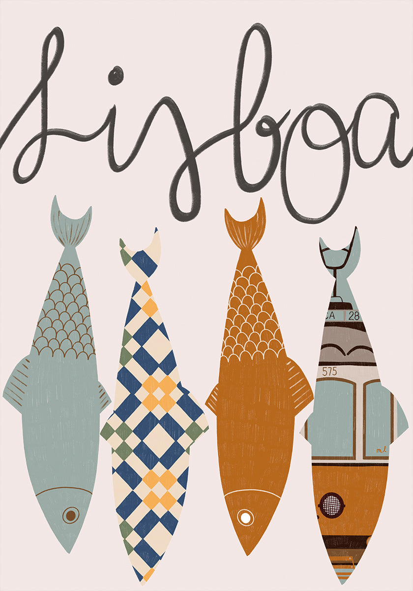 By Menina Lisboa, this lively Lisbon scene parades a school of sardines in ocean blues and tram-yellow tones over azulejo-inspired tiles. Playful yet elegant, it blends folk tradition with modern city energy, evoking markets, seaside nights, and the bright rhythm of Portugal’s capital. From tiled facades to salty breezes, it’s Lisbon at a glance.