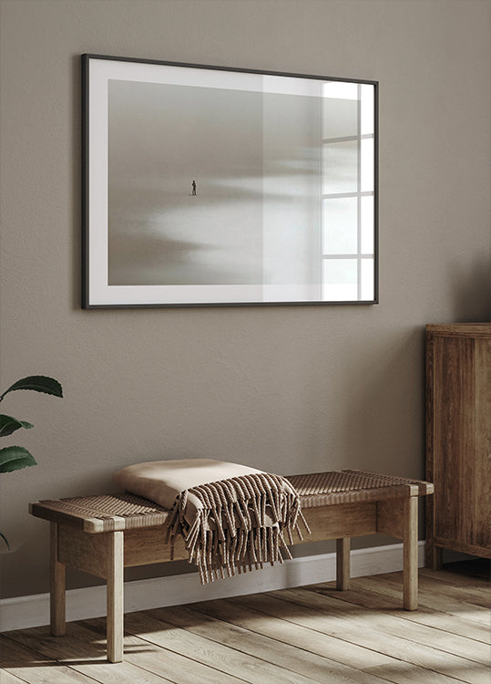A solitary figure stands quietly on a vast, windswept shore, shrouded in mist and soft shadows. This minimalist artwork captures introspection, solitude, and the meditative calm of a quiet moment by the sea.
