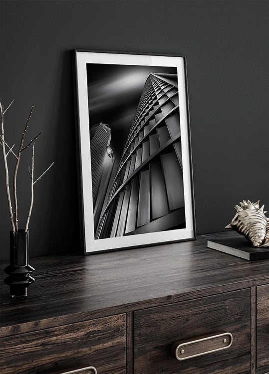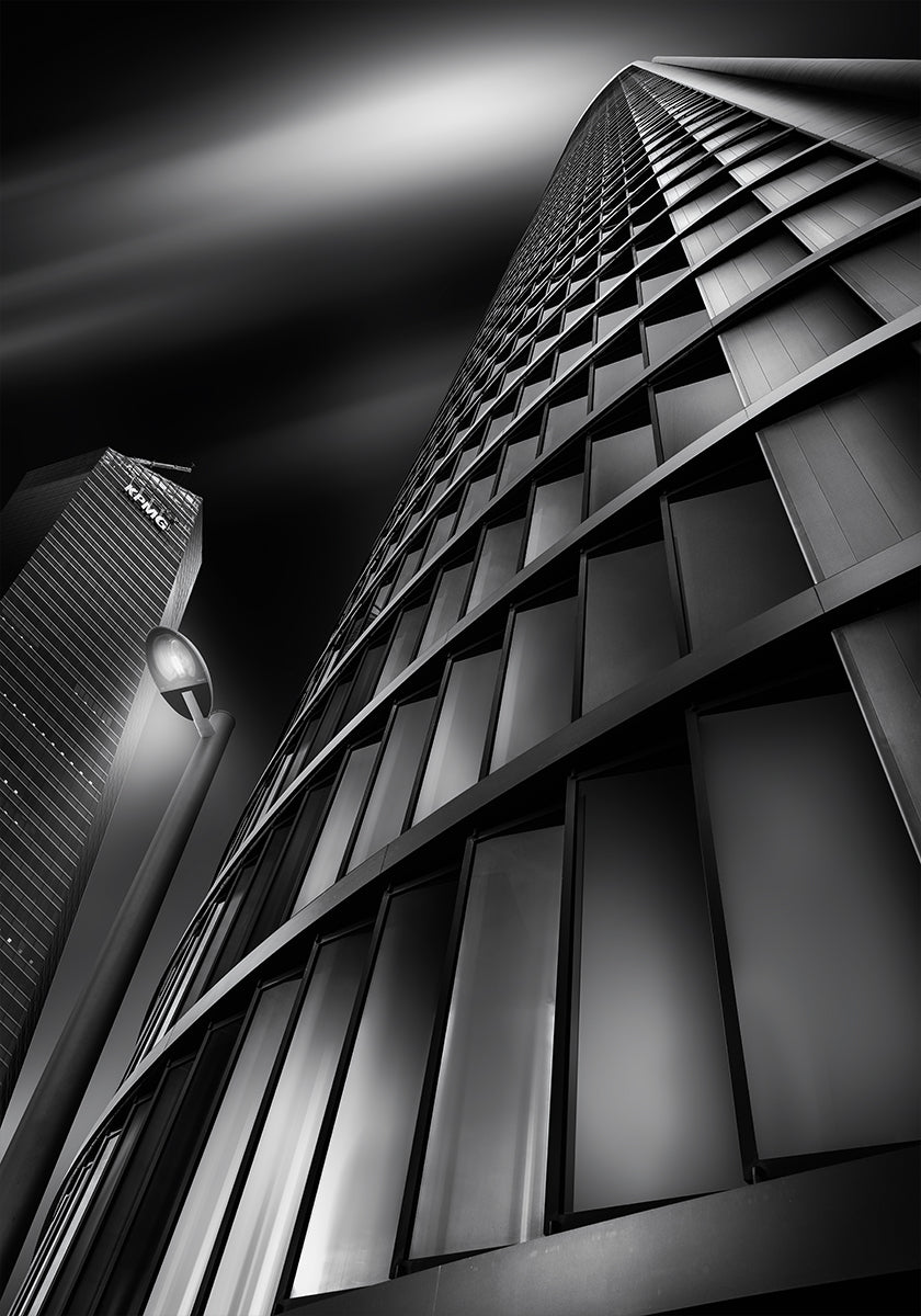 Jorge Ruiz Dueso captures a striking upward view in Madrid’s CTBA: sleek glass towers converging toward a sliver of sky as a solitary streetlight punctuates the scene. Geometric lines, reflections, and deep contrasts create a dynamic urban portrait that celebrates modern architecture and the drama of light.