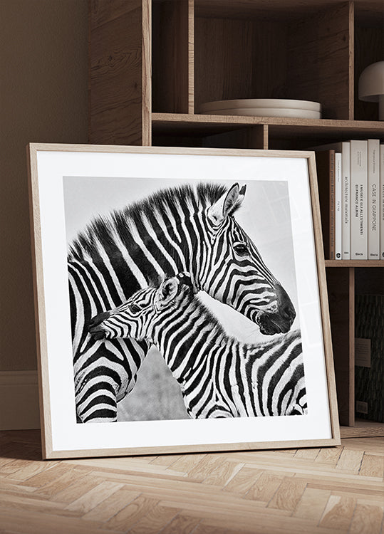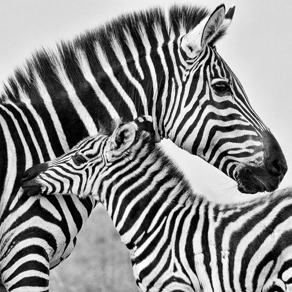 Two zebras press their striped heads together in a tender monochrome embrace, their manes brushing like brushstrokes against the vast Masai Mara savannah. A quiet moment of protection and affection—mother and foal—captured in bold contrast, radiating calm, intimacy, and the untamed romance of the wild.
