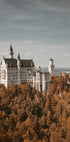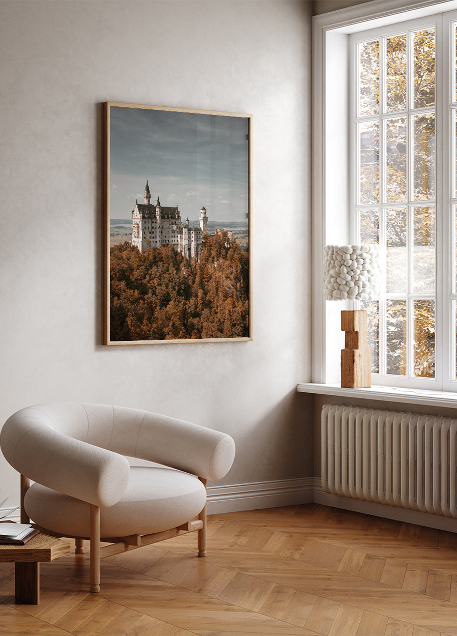 Plakaten viser et vakker slott som er plassert på en høyde, omfavnet av frodige, høstfargede trær. Slottet har karakteristiske tårn og detaljerte fasader, preget av en eventyrlig arkitektur. I bakgrunnen strekker landskapet seg ut med grønne og gyldne nyanser under en klar himmel, som gir en stemningsfull og majestetisk atmosfære.