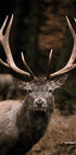 A striking portrait of a majestic deer with its impressive antlers standing amidst the golden hues of an autumn forest. The intimate focus captures the regal demeanor of this wild creature, embodying strength and grace in its natural habitat. The muted, earthy tones of the scene enhance the mystical and serene ambiance of the forest in fall.