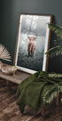A captivating portrait of a Highland cow standing proudly in a misty field. Its thick, shaggy coat and curved horns create a striking contrast against the soft, muted background. This rustic yet elegant print embodies the beauty of nature and is perfect for farmhouse decor, Scandinavian interiors, and animal lovers.