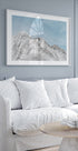 Glide into a dreamlike winter panorama where marble-like peaks rise above a calm sea, their snowy slopes softened by drifting clouds. A distant horizon shimmers under a frosted sky as a flock of birds sweeps across the scene, adding movement to the serene, sophisticated landscape. Cool tones and subtle textures evoke marble and mist.