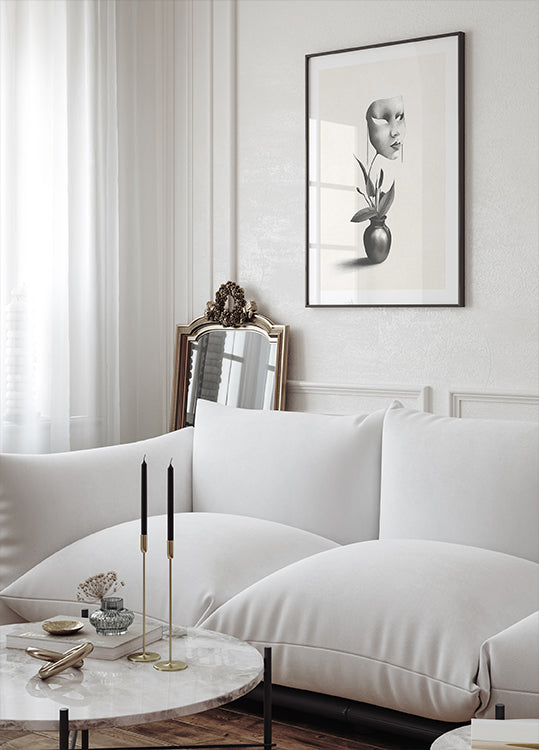 A surreal black-and-white illustration featuring a mysterious floating mask emerging from the stem of a potted plant. The combination of organic and artificial elements creates a striking contrast, evoking themes of identity, transformation, and hidden emotions. A perfect statement piece for conceptual art lovers and modern interiors.