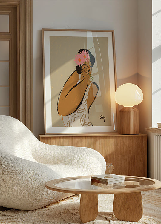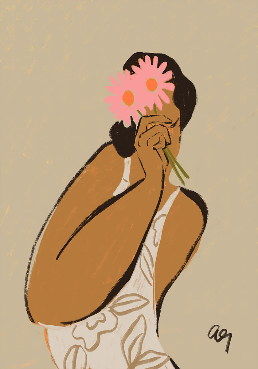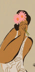 Mask by Arty Guava captures a serene woman with closed eyes, her face framed by lush tropical leaves and vivid florals. Bold, sunlit colours and fluid shapes create a dreamy island mood, blending figurative portraiture with botanical motifs for a modern, eye-catching statement on calm and self-expression.