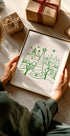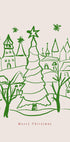 A simple yet charming line-drawing illustration of a winter village. The scene is drawn in green lines against a light background, showing whimsical houses, church towers, and snowy rooftops. At the center stands a large Christmas tree topped with a star, surrounded by bare winter trees. The style is playful and childlike, capturing the cozy and magical spirit of Christmas. At the bottom, the text “Merry Christmas” is written in red.
