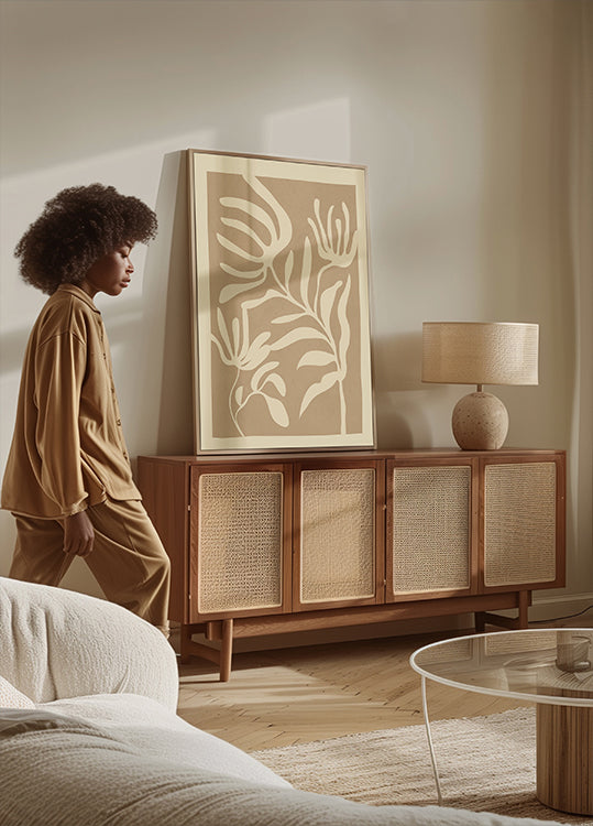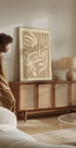 Organic leaves glide through soft, geometric blocks in this serene abstract botanical. Curving stems and layered shapes create quiet movement and balance, with earthy terracotta, olive, and sand tones lending warmth. A calming focal point for modern spaces—from living rooms to creative studios and calm corners.
