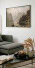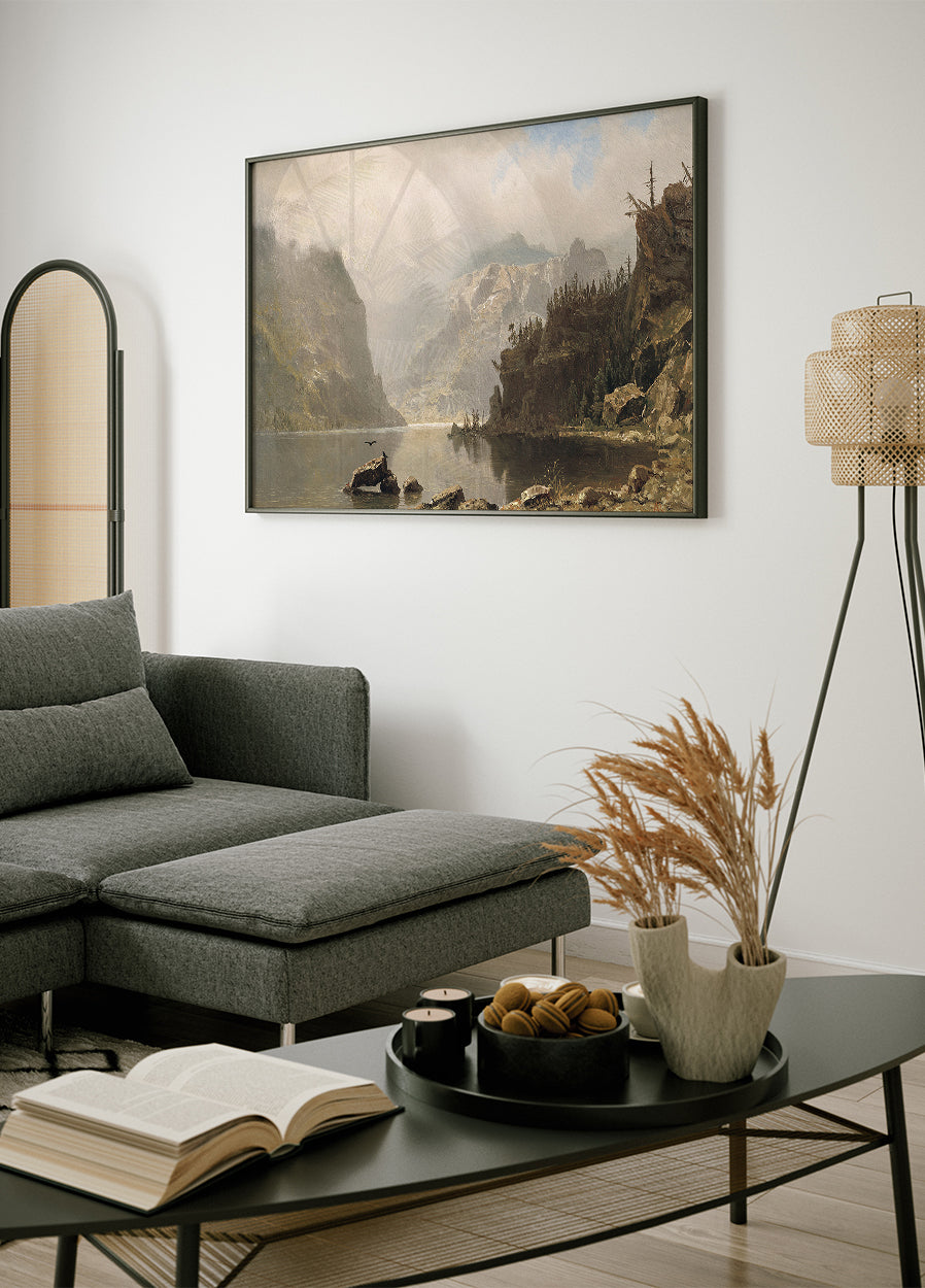 A serene landscape painting by Albert Bierstadt, showcasing a tranquil body of water surrounded by majestic mountains. The scene is enveloped in soft, misty clouds with patches of light breaking through. Lush green trees line the rocky shoreline, while a lone bird glides over the water, enhancing the peaceful atmosphere of the wild western terrain.