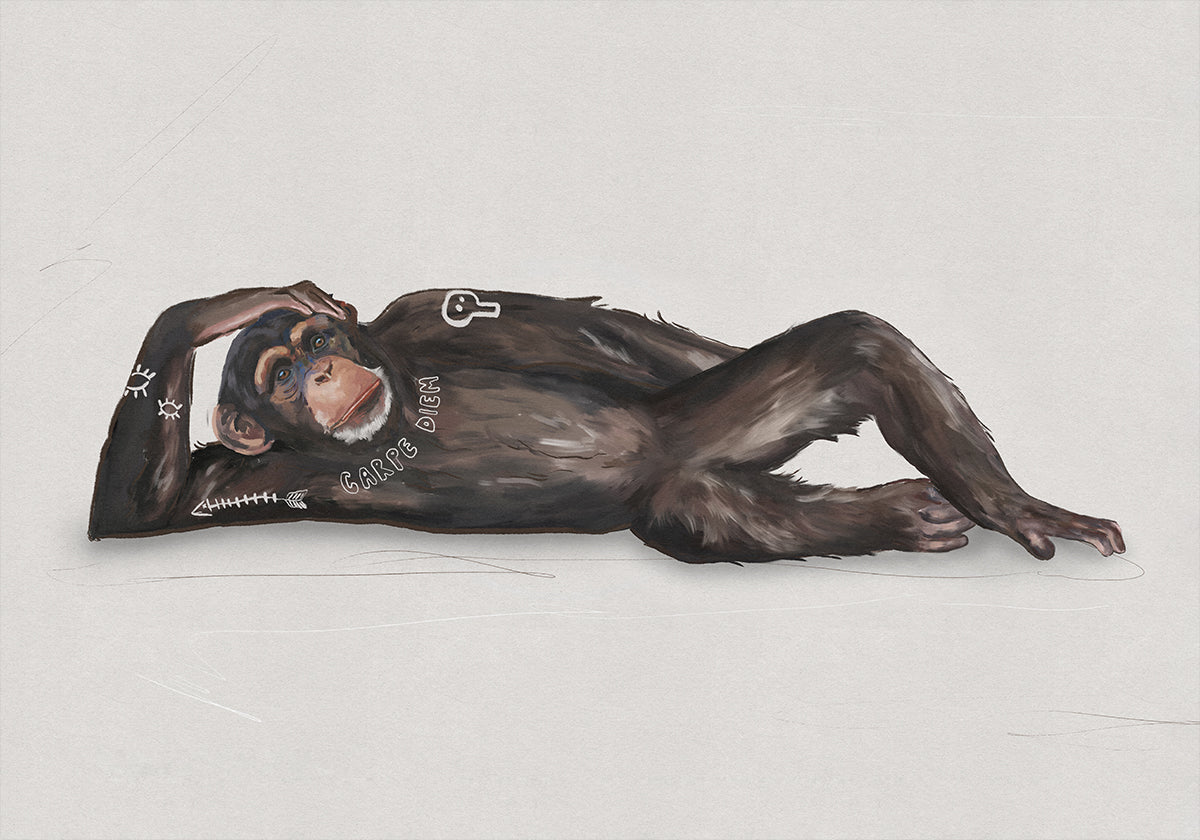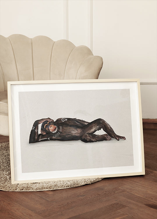 Gabriella Roberg’s Monday Afternoon captures a tattooed chimp sunk in lounge-mode, eyes half-lidded and limbs draped with effortless swagger. Bold, minimalist linework and playful ink tell a cheeky story of rebellion meeting rest, radiating wit, calm, and mischievous charm for any space. A wry wink for living rooms, studios, and laid‑back offices.