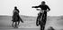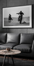 A powerful black and white photograph capturing the striking contrast between tradition and modernity — a horse and a motocross bike racing side by side across the desert. The dramatic tones and dynamic movement make this a bold statement piece for any space.