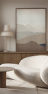 A serene, minimalist landscape: sculpted mountain forms rise in soft earth tones above a still lake that calmly mirrors their contours. Clean white space and simple, layered shapes create balance and depth, evoking open skies and quiet horizons. A modern, tranquil accent for any room. Muted contrasts invite calm, contemplative moments.