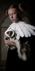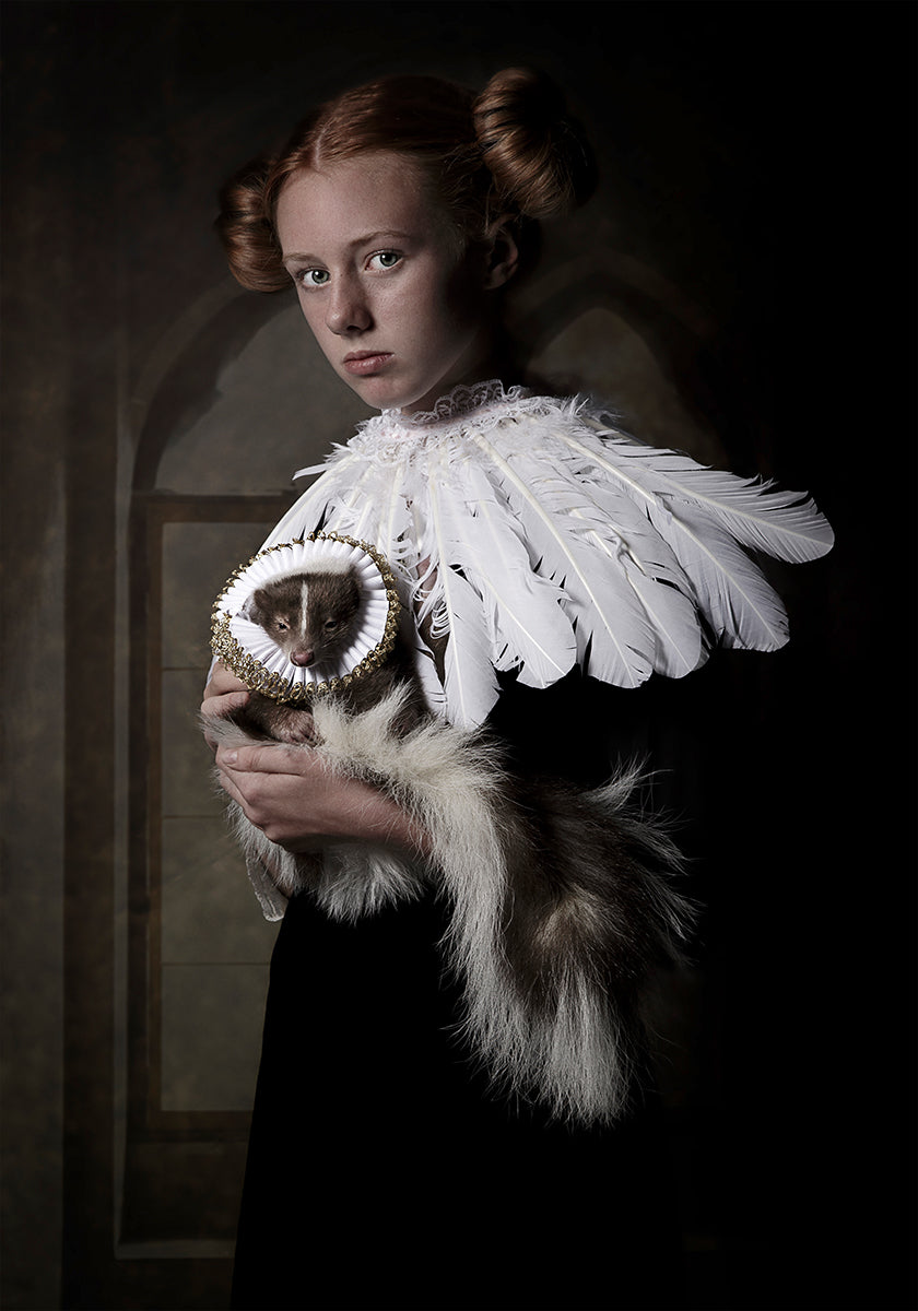 By Dutch artist Carola Kayen-Mouthaan, this evocative portrait shows a composed young woman in vintage, medieval-tinged dress, braided hair and feathered collar, sharing the frame with a gentle skunk. Dramatic, nostalgic lighting and refined textures lend old-world elegance with a playful, fairy-tale twist, with echoes of Renaissance portraiture.