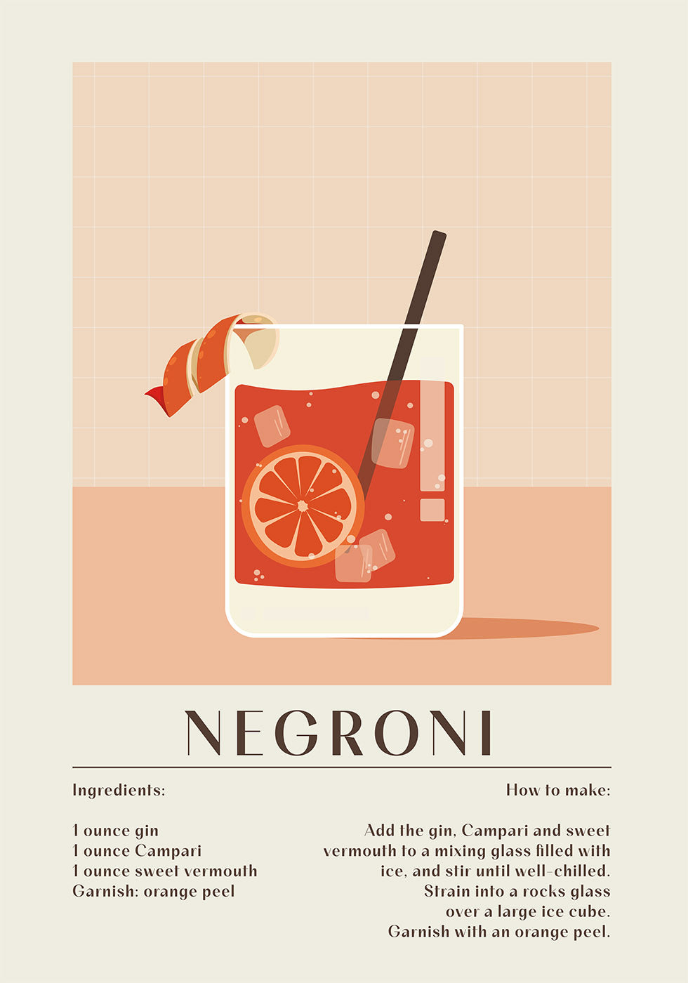 A stylish poster that celebrates the Negroni cocktail through an abstract artwork, perfect for adding a sophisticated and artistic touch to the kitchen. This poster combines modern design with artistic interpretations of the Negroni's characteristic colors and taste, providing an inspiring and stylish decoration. Ideal for creating a festive and creative atmosphere in the kitchen with an artistic twist.