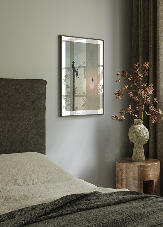 A surreal and thought-provoking artwork depicting a lone fisherman perched atop a pole, fishing for a glowing light bulb. This imaginative piece symbolizes creativity, inspiration, and the pursuit of new ideas, making it a perfect addition to a workspace or creative space.