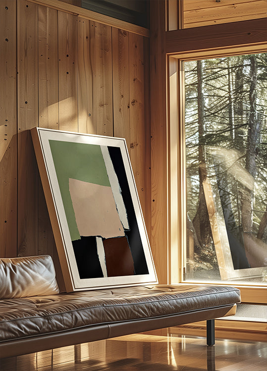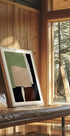 Andrea Reichhart’s Noir series no.6 explores minimalist geometry: layered soft beige, white, and brown fields punctuated by deep black and muted green, where clean lines and rounded forms overlap to create quiet tension. A modern, abstract focal point that brings calm balance and subtle contrast to any space.