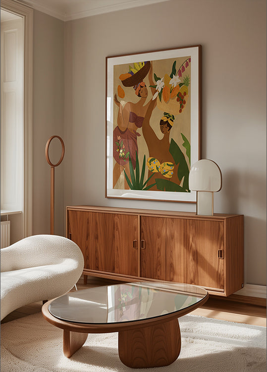 Sun-soaked and playful, Opps Papaya by Arty Guava captures a tropical moment in bold, modern shapes: ripe papayas, leafy palms, and sunlit color blocking set against a vibrant palette. Part still life, part daydream, it radiates island warmth and contemporary charm—perfect for kitchens, studios, and sunny corners.