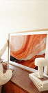 Molten swirls of orange, peach, and soft beige run through this abstract, veined with inky blacks like tiger stripes in polished stone. Organic currents ripple across the surface, balancing warmth and serenity with dynamic movement—an eye-catching centerpiece for modern spaces with an earthy, refined mood.