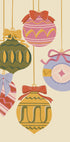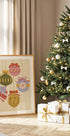 Bring retro holiday magic home with this cheerful illustration by Nikita Jariwala: dangling glass ornaments, satin bows, and twirling ribbons floating in a wintry glow. Playful, nostalgic shapes and a cozy vintage palette capture childlike wonder—perfect for adding merry sparkle to walls all season long.