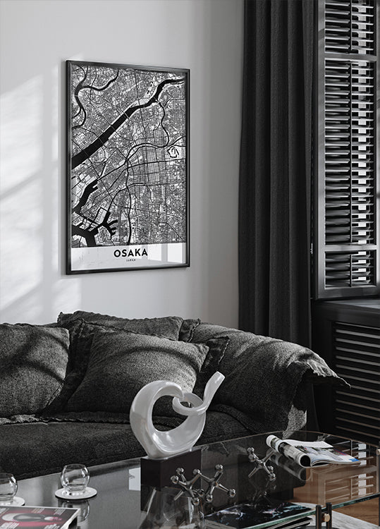 See Osaka distilled into elegant lines: a black-and-white city map tracing rivers, bridges, and the compact grid from Umeda to Namba and Dotonbori. Fine labels outline districts, canals, and bayfront, while Shinsaibashi anchors the heart—an urban portrait balancing clarity, energy, and timeless Kansai character.