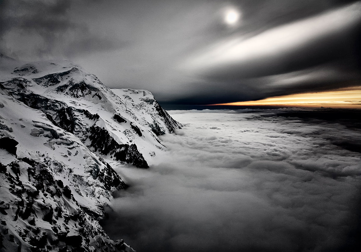 Rise above the weather with this moody alpine vista by photographer Tristan Shu: a frosted ridge of the Mont Blanc massif cuts through a rolling sea of clouds, while pale winter sun filters through mist and haze. Icy blues and soft grays shape a serene yet powerful scene, evoking altitude, silence, and endless sky.