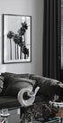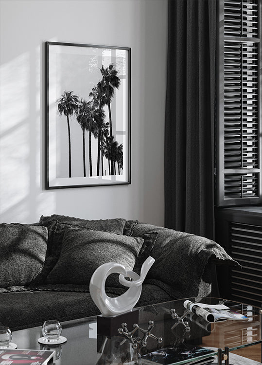 A stylish black-and-white photograph capturing tall palm trees swaying in the wind. The minimalistic and timeless aesthetic makes it a perfect piece for modern and coastal interiors.