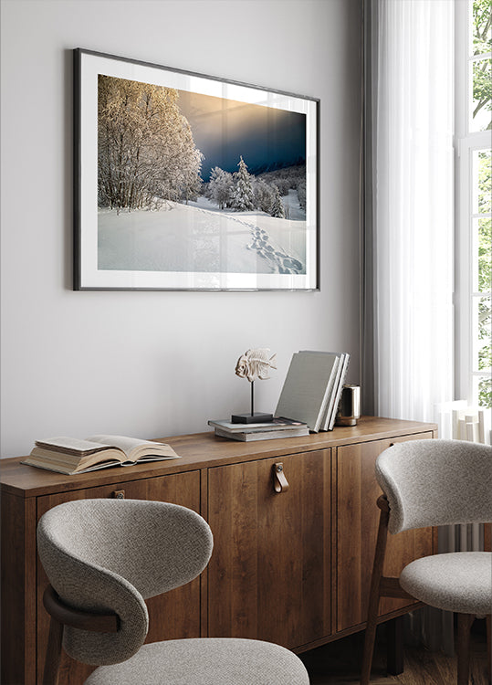 A hushed winter track cuts through a frost-laced forest, pale light pooling over snow as dark trunks stand like sentinels. Subtle footprints invite you forward, capturing the calm of a frozen morning. Path by Christophe Baudot evokes solitude, clarity, and the quiet pull of possibility. A serene guideway for contemplative spaces and winter dreams.