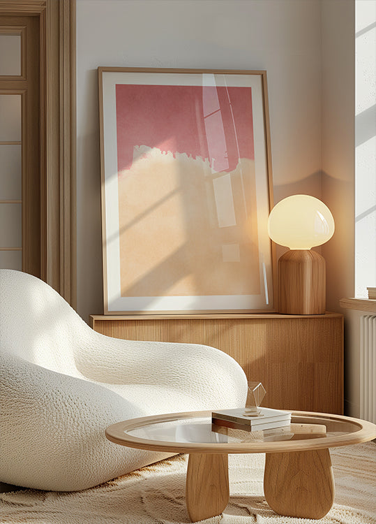 Soft washes of peach and pink drift across the page like dawn-lit clouds, blending gentle brushstrokes and airy negative space. This minimalist abstract evokes a warm horizon and calm, nostalgic glow—perfect for serene interiors and mid-century palettes, from bedroom to studio. Its sun-kissed tones pair beautifully with warm wood and soft neutrals.