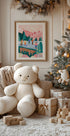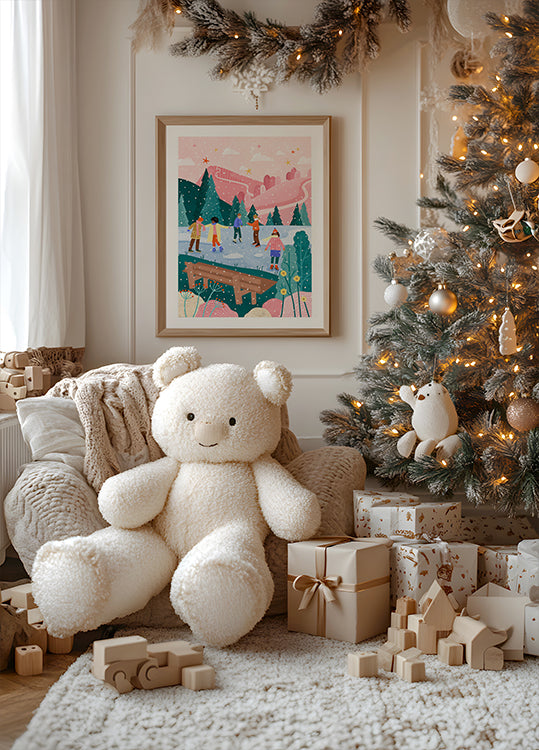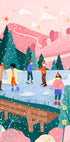 Glide into winter wonder with this whimsical illustration by Bea Müller: families and children sweep across a frozen lake, scarves fluttering, as snowy pines and blue mountains frame the scene. A glowing Christmas tree anchors the rink, capturing festive joy, playful motion, and cozy seasonal charm and warmth.