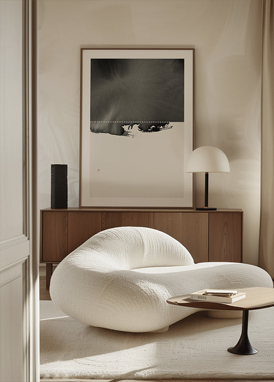 Perforation by Thoth Adan is a serene monochrome study where ink and water form a hushed horizon. A gentle band of perforated dots drifts across a misty field, evoking snow, breath, and stillness. Minimal yet poetic, it invites slow looking—balancing edge and void, rhythm and pause, winter and calm.