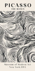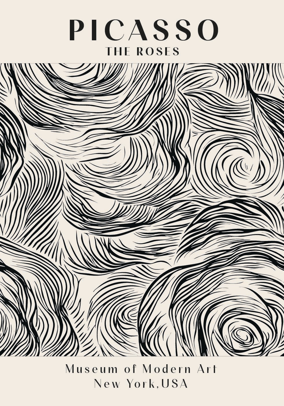 A modern abstract poster inspired by Picasso, featuring swirling black lines forming an intricate pattern resembling roses. The high-contrast black and beige palette enhances the artistic and sophisticated appeal. A tribute to contemporary and abstract art, this piece is perfect for modern interiors and art lovers.