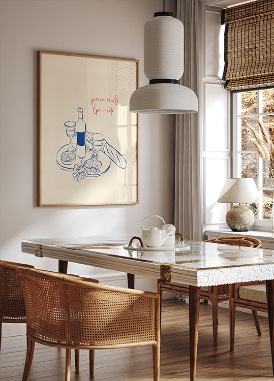 A minimalist line illustration capturing an elegant picnic scene: a bottle of wine, two glasses, cheese, grapes, and a baguette — accompanied by the handwritten phrase picnic club 6pm – late. Perfect for creating a relaxed, sun-drenched mood in a kitchen, dining space, or Mediterranean.