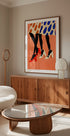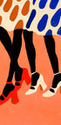 City-chic and playfully retro, Polka Dot Steps captures a parade of stylish legs in candy-bright heels and polka-dot skirts ascending a bold, graphic staircase. Gossip seems to flutter in the air as clean shapes and mid-century color blocks create motion, wit, and instant attitude for hallways, dressing rooms, or gallery walls.