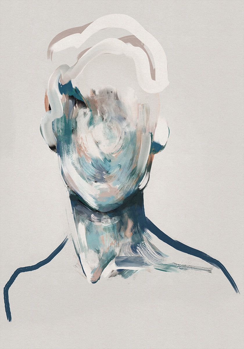 Portrait Noir No.I by Gabriella Roberg presents a faceless male silhouette dissolving into inky navy tones, where fish glide across crisp collage planes and tidal textures. A cinematic, minimalist coastal reverie—part portrait, part maritime dream—evoking hush, depth, and modern noir allure. Perfect for serene living rooms and gallery walls.