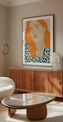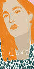 Beate Tubach’s vibrant portrait captures a confident woman with vivid orange hair, rendered in a contemporary, pop-art style. Playful dots, leopard accents, and deep green and copper tones create a chic, fashion-forward mood. Minimal lines and bold color blocks celebrate feminine expression and modern decor.