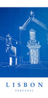 This artwork features a minimalist line drawing of a charming Lisbon street scene, set against a rich, deep blue background. The simple white lines capture the architectural elegance and cultural spirit of Portugal’s capital, highlighting a traditional building façade with striking details. The bold contrast between blue and white evokes a sense of calm, warmth, and Mediterranean character, making this poster a stylish tribute to the beauty of Lisbon.