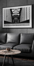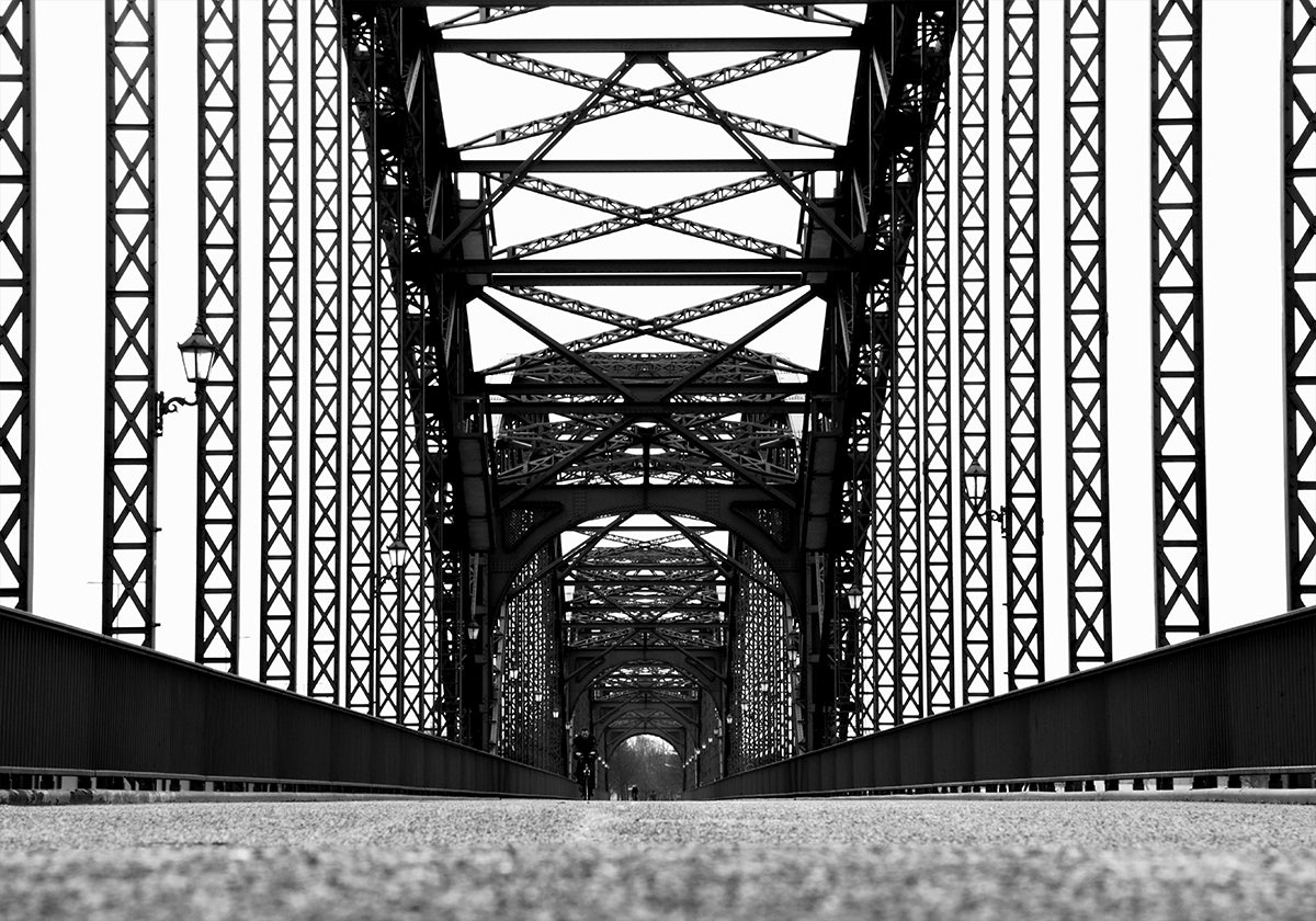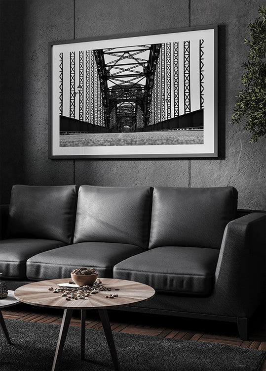 This striking black and white photograph captures the strong geometry of a steel bridge in Hamburg. The repeating iron patterns, sharp contrasts, and deep perspective create a bold architectural artwork that blends industrial beauty with timeless design, perfect for a modern and graphic gallery wall.