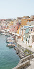 Sunlit Procida shimmers in candy-coloured tiers: pastel facades cascading to a bustling harbour where small boats drift on Tyrrhenian blue. Narrow lanes weave between cliffside houses, laundry flutters, and summer light gilds every wall. A vibrant Mediterranean escape, captured by photographer Henrike Schenk.