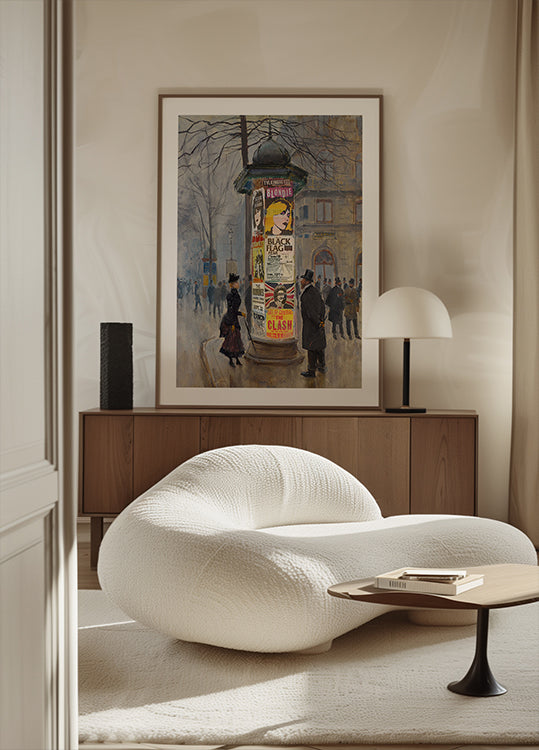 An imaginative collage by Dikhotomy merges a wintry Paris street with punk energy: snowy façades and trees meet weathered concert posters for Blondie, The Clash, Sex Pistols and the Ramones. Painted with impressionist brushstrokes, it nods to masters like Monet, Van Gogh, Manet and Toulouse-Lautrec.