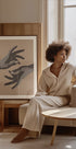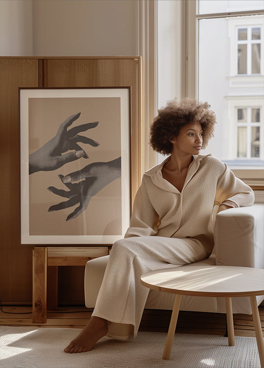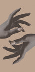An evocative mid-century inspired portrait of reaching hands, composed in bold, abstract shapes and earthy beige, brown and deep black tones. The layered collage feel adds movement and intrigue, balancing soft curves and crisp edges. A modern statement piece that suggests connection, longing, and quiet strength.