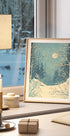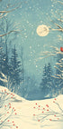 Amid a hush of winter, a vivid red bird perches on frosted branches, its scarlet plumage glowing against a drifted forest of white. Gentle snowflakes fall through tall trees, softening the woodland scene and inviting calm. A serene, festive moment captured in nature’s quiet, perfect for cozy seasonal decor.